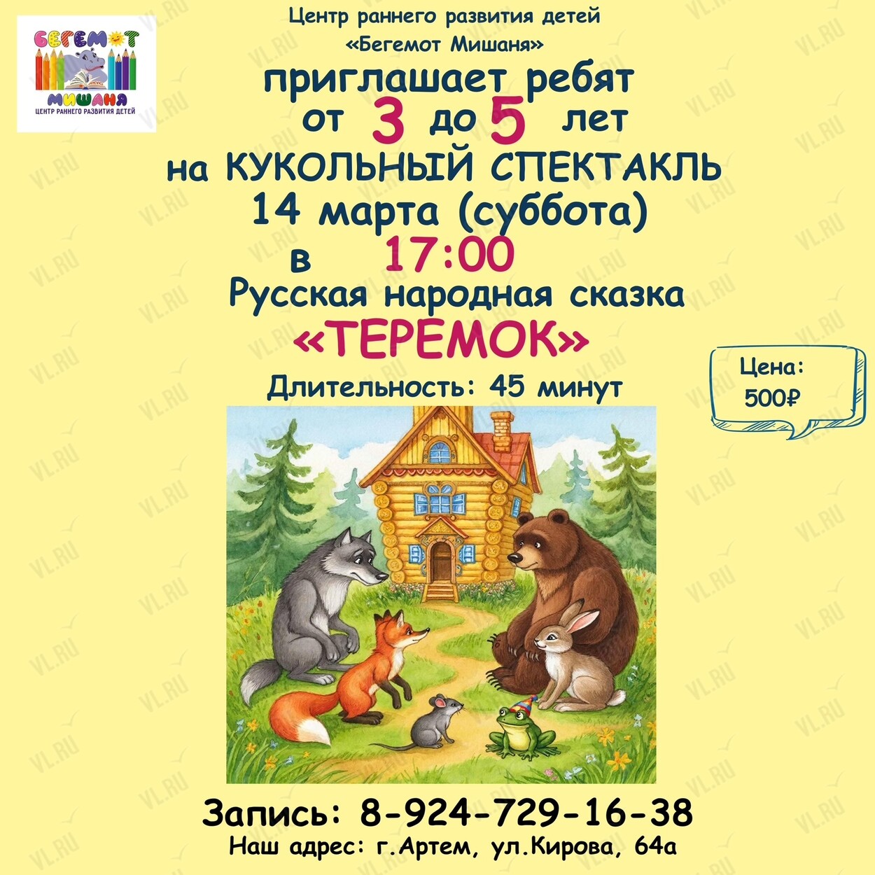 Центр раннего развития детей «Бегемот Мишаня» приглашает на кукольный спектакль «Теремок» для малышей 3-5 лет!