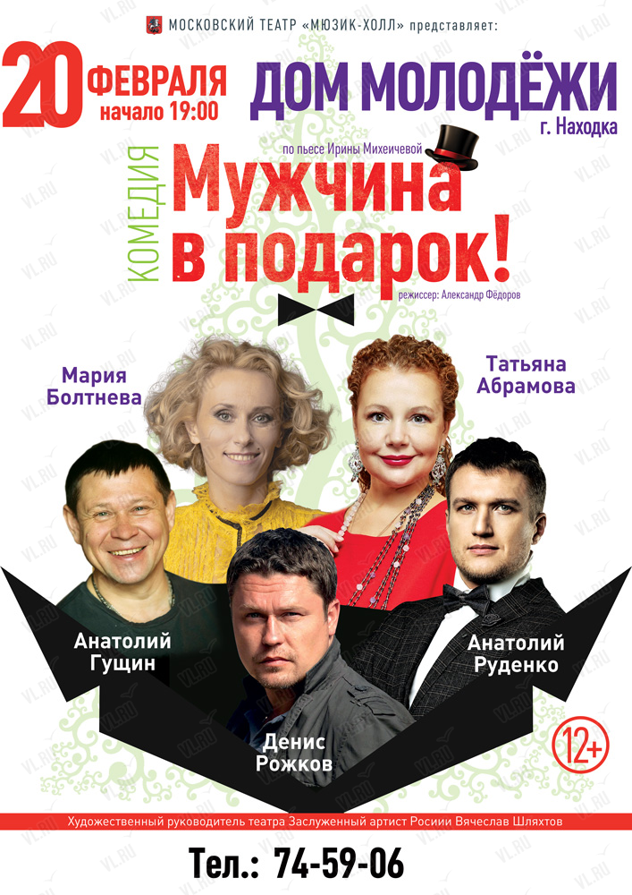 Московский театр «Мюзик-холл» продолжает гастрольный сезон премьерной комедией «Мужчина в подарок!» которая будет показана 20 февраля в Доме Молодежи г. Находка.