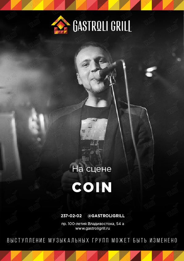 Приглашаются все желающие провести приятный вечер в Gastroli Grill! Выступит группа Coin!