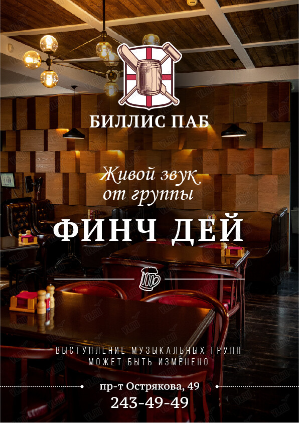 Английский паб Биллис паб приглашает на выступление группы Finch Day!