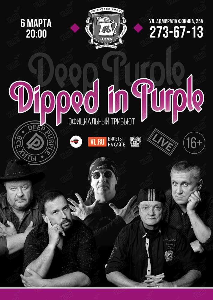 6 марта, в ресторане "Hans" группа Dipped In Purple выступит с большим концертом, посвящением легендарным DEEP PURPLE, все великие хиты в одном шоу.