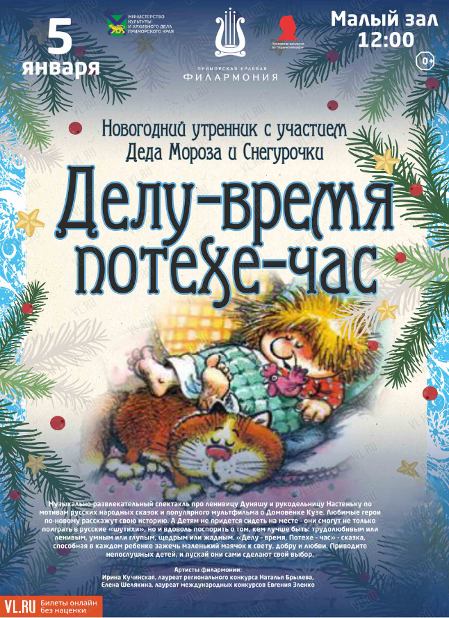 Музыкально-развлекательный спектакль про ленивицу Дуняшу и рукодельницу Настеньку по мотивам русских народных сказок и популярного мультфильма о Домовёнке Кузе. Любимые герои по-новому расскажут свою историю. А Детям не придется сидеть на месте – они смогут не только поиграть в русские «шутихи», но и вдоволь поспорить о том, кем лучше быть: трудолюбивым или ленивым, умным или глупым, щедрым или жадным. «Делу – время, Потехе – час» - сказка, способная в каждом ребенке зажечь маленький маячок к свету, добру и любви. Приводите непослушных детей, и пускай они сами сделают свой выбор.
