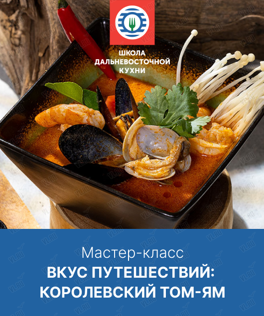 Все желающие приглашаются на мастер-класс «Вкус путешествий: королевский том-ям» от Школы дальневосточной кухни. Готовим главный суп Таиланда с креветками и ракушками из Японского моря и тайский манговый пудинг.
