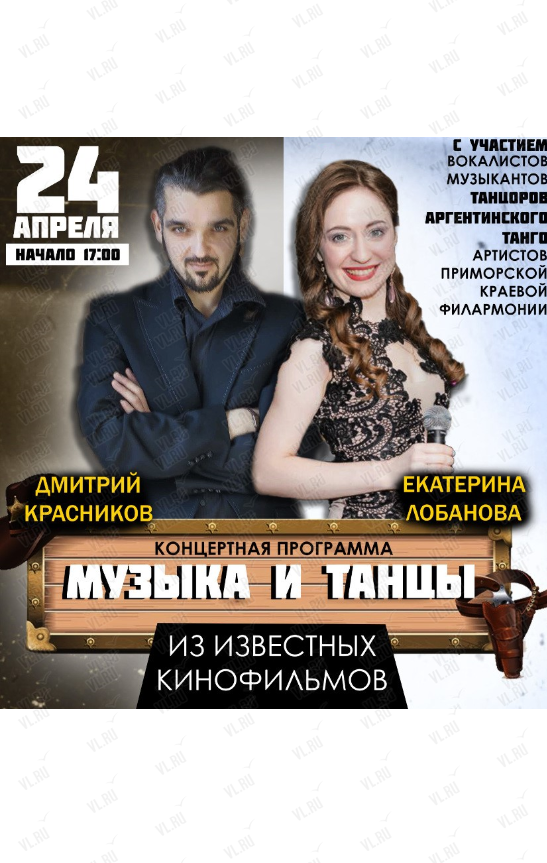 А ты любишь кино?.. Какие твои любимые фильмы? А актёры? Концертная программа "Музыка и танцы из известных кинофильмов" от Екатерины Лобановой и Дмитрия Красникова - 24 апреля во Владивостоке.