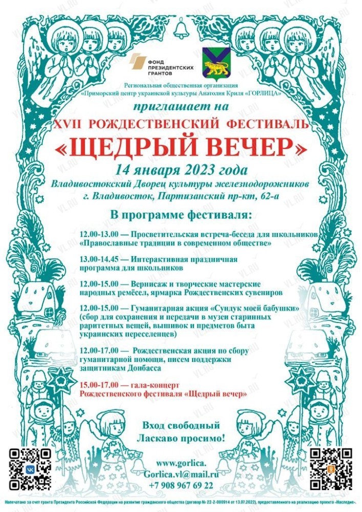 Нынешнее событие пройдёт в рамках общественно значимой программы «Наследие», которую Региональная общественная организация «Приморский центр украинской культуры Анатолия Криля «Горлица» реализует при поддержке Фонда Президентских грантов и гранта Губернатора Приморского края.