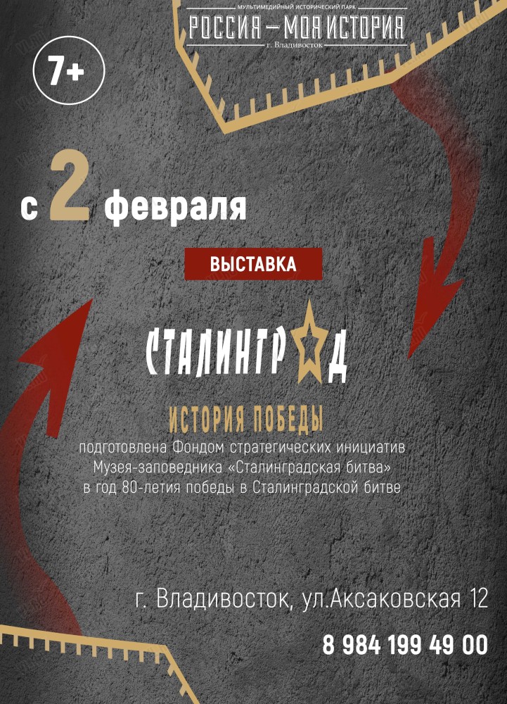 История Сталинградской битвы предстанет перед зрителем Владивостока в историческом парке «Россия-Моя история» с 2 февраля. Выставка в хронологическом порядке охватит ключевые сюжеты сражения: «Воздушная блокада», «Бои на дальних и ближних подступах к Сталинграду», операция «Зимняя гроза», «Тацинский рейд», «Кольцо», «Бои за северные районы Сталинграда», «Мамаев курган», «Дом Павлова».
