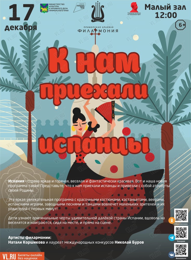 Эта яркая увлекательная программа с красочными костюмами, кастаньетами, веерами, испанскими играми, заводными песнями и танцами вовлечет маленьких зрителей и их родителей с первых минут!