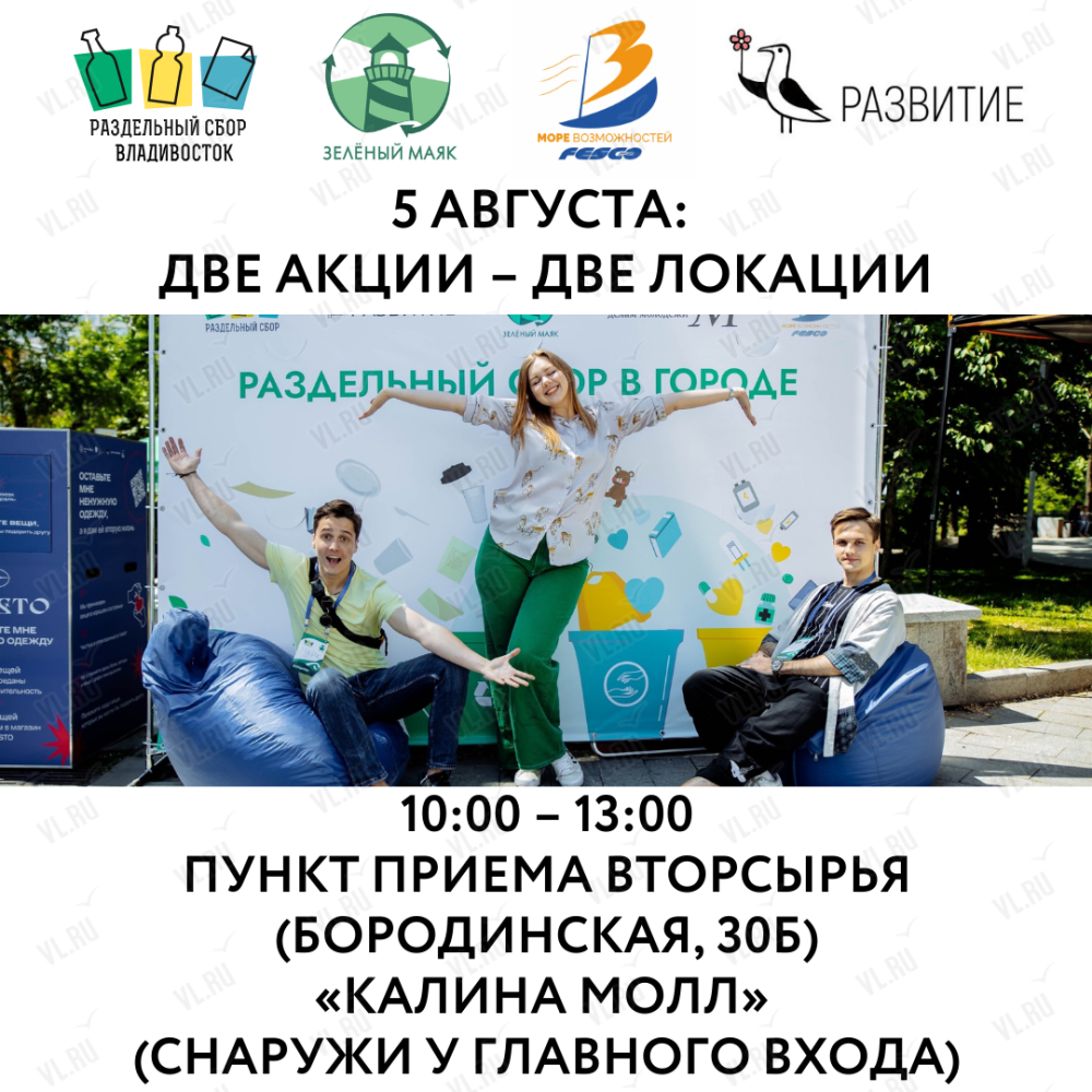 Акция на Калина молл пройдёт при поддержке FESCO, АНО ДПО и К «Развитие», Управления по делам молодёжи г. Владивостока, Группы компаний «Славда» и предприятия по переработке ООО «ГринЭко».