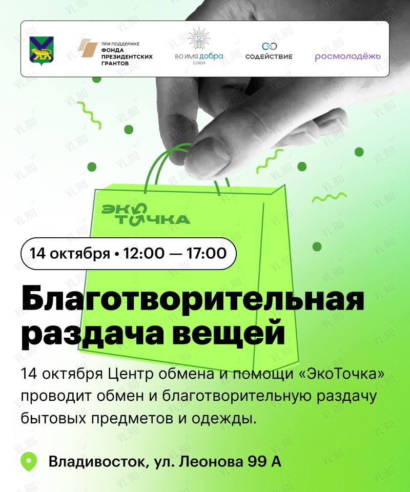 Союз благотворительных и социальных организаций «Во имя добра» приглашает на благотворительную раздачу бытовых товаров и одежды. Раздача пройдет в Центре обмена и помощи "ЭкоТочка" 14 октября с 12:00 до 17:00.