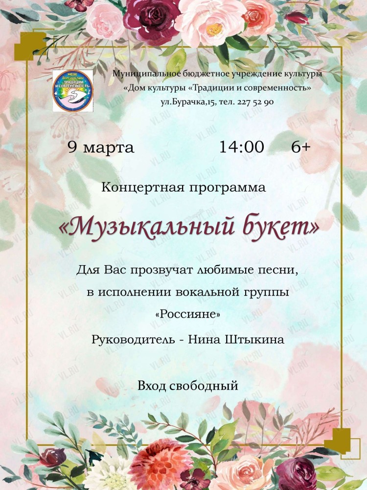 Дом культуры «Традиции и современность» в рамках творческого проекта «Вечера искусств на Бурачка, 15» приглашает вас 9 марта на праздничную концертную программу «Музыкальный букет».