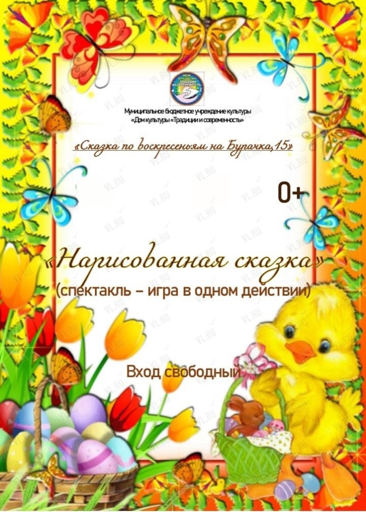 МБУК «Дом культуры "Традиции и современность"» в рамках проекта «Сказка по воскресеньям на Бурачка, 15» приглашает ребят и их родителей 29 марта посмотреть спектакль «Нарисованная сказка» по мотивам произведений К. Чуковского «Цыплёнок», «Так и не так», «Чудо-дерево» и др.