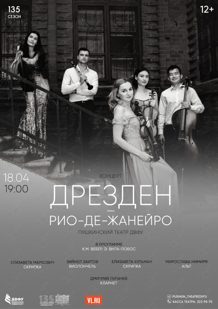 18 апреля в Пушкинском театре ДВФУ прозвучит камерная музыка в исполнении квартета Amici – солистов симфонического оркестра Приморской сцены Мариинского театра. Два произведения, охватывающие два века, две разных страны и двух абсолютно разных композиторов. Всё это слилось в незаурядном концерте «Дрезден – Рио-де-Жанейро».