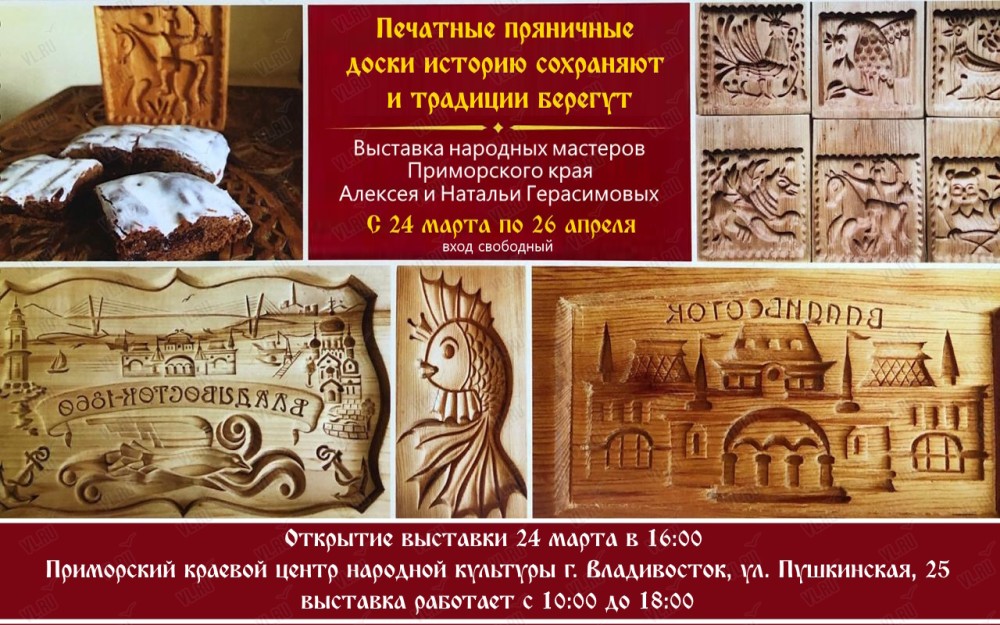 С 24 марта по 26 апреля в Приморском краевом центре народной культуры будет доступна к посещению выставка народных мастеров Приморского края Алексея и Натальи Герасимовых «Печатные пряничные доски историю сохраняют и традиции берегут».