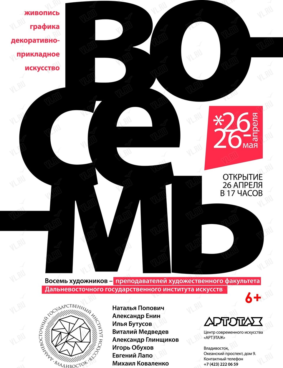 Выставка восьми художников, преподавателей художественного факультета Дальневосточного государственного института искусств: Натальи Попович, Александра Енина, Игоря Бутусова, Виталия Медведева, Александра Глинщикова, Игоря Обухова, Евгения Лапо и Михаила Коваленко.