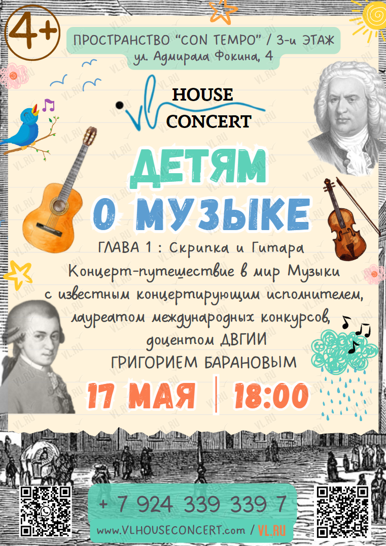 Музыкальный проект VL House Concert представляет новую уникальную серию детских интерактивных концертов-встреч "Детям о Музыке"! Первый концерт "Глава 1: скрипка и гитара" состоится 17 мая в 18.00 в творческом пространстве кафе Con tempo и ставит перед собой цель познакомить дошкольников от 4 до 7 лет с удивительным миром звуков, составляющих музыкальные образы.
