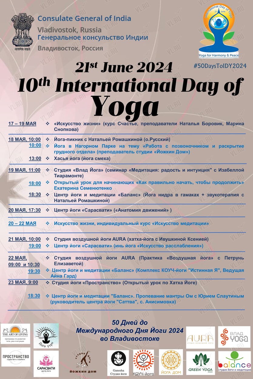 В преддверии Международного Дня Йоги, который по решению ООН ежегодно отмечается во всем мире 21 июня, Генеральное Консульство Индии во Владивостоке и йога сообщество Владивостока дают старт ежедневных йога –мероприятий. Мы открываем обратный отсчет: 50 дней до Международного Дня Йоги. Каждый день в студиях, центрах йоги, а также на публичных площадках Владивостока состоятся мастер-классы, занятия, лекции, в которых смогут принять участие как уже опытные йоги, так и новички, которые хотели бы поближе познакомиться с этой популярной ныне практикой.