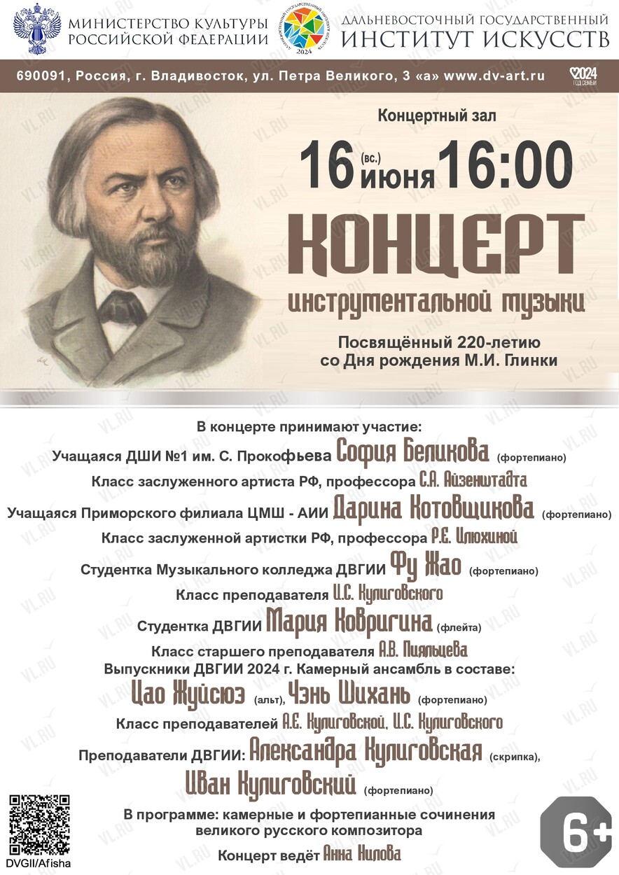 16 июня в концертном зале ДВГИИ пройдет концерт, посвященный 220-летию со дня рождения М.И. Глинки.