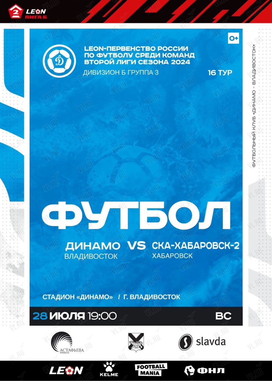 В воскресенье, 28 июля, в 19:00, на стадионе «Динамо», лидер Первенства Второй лиги Б футбольный клуб «Динамо-Владивосток» в принципиальном матче сразится с командой «СКА-Хабаровск-2»!