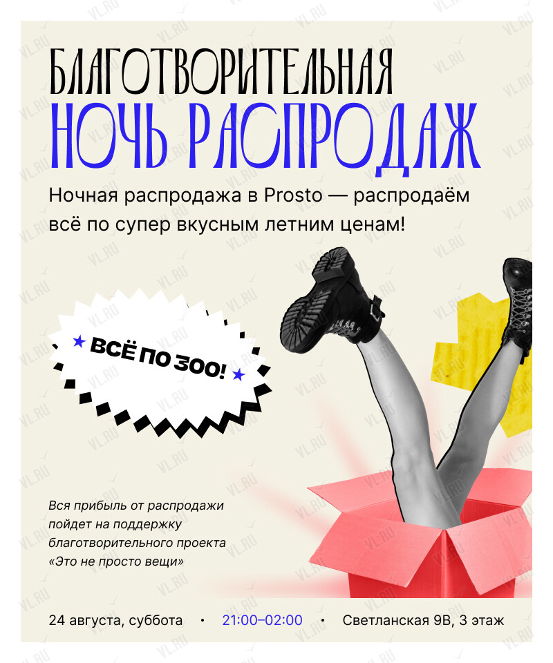 Союз "Во имя добра" и благотворительный секонд-хенд Prosto приглашают на благотворительную ночь распродаж, которая пройдет в субботу 24 августа с 21:00 до 2:00!