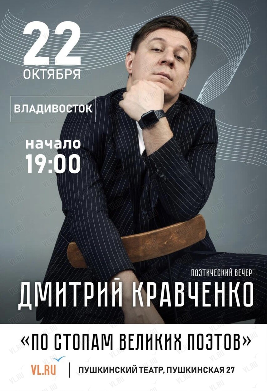 22 октября на сцене Пушкинского театра пройдет поэтический вечера «По стопам великих поэтов» Дмитрия Кравченко.
