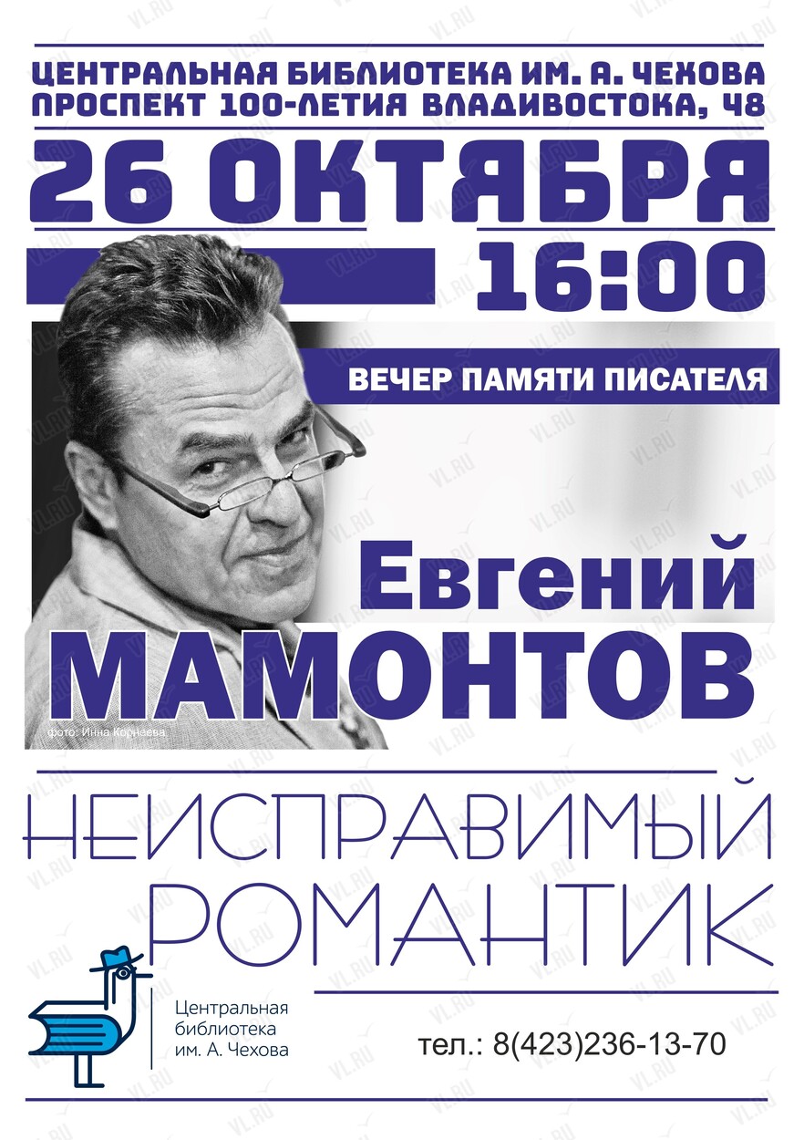 Вечер памяти писателя Евгения Мамонтова «Неисправимый романтик» состоится 26 октября в Центральной библиотеке им. А. Чехова.