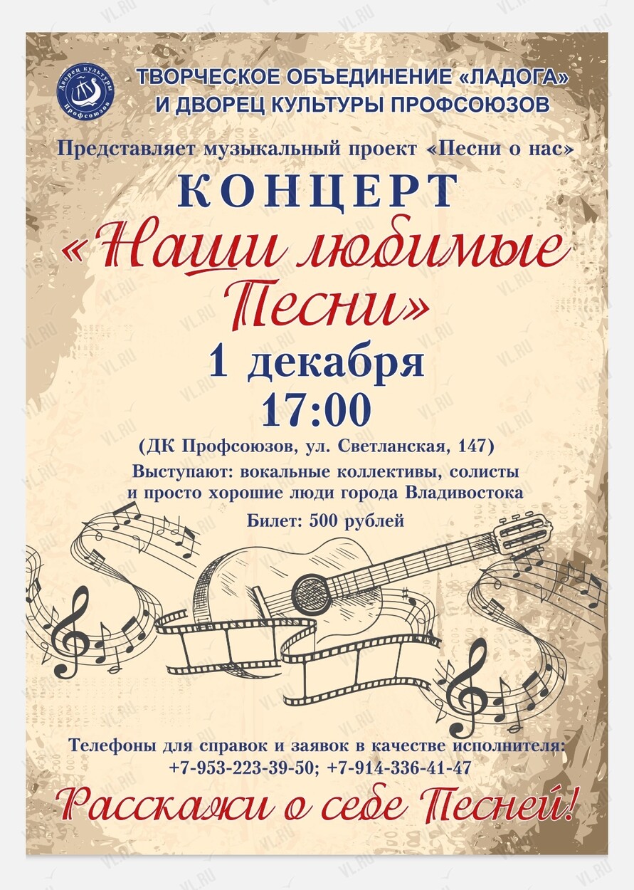 Творческое объединение «ЛАДОГА» приглашает жителей и гостей города Владивостока на концерт «Наши любимые песни»!