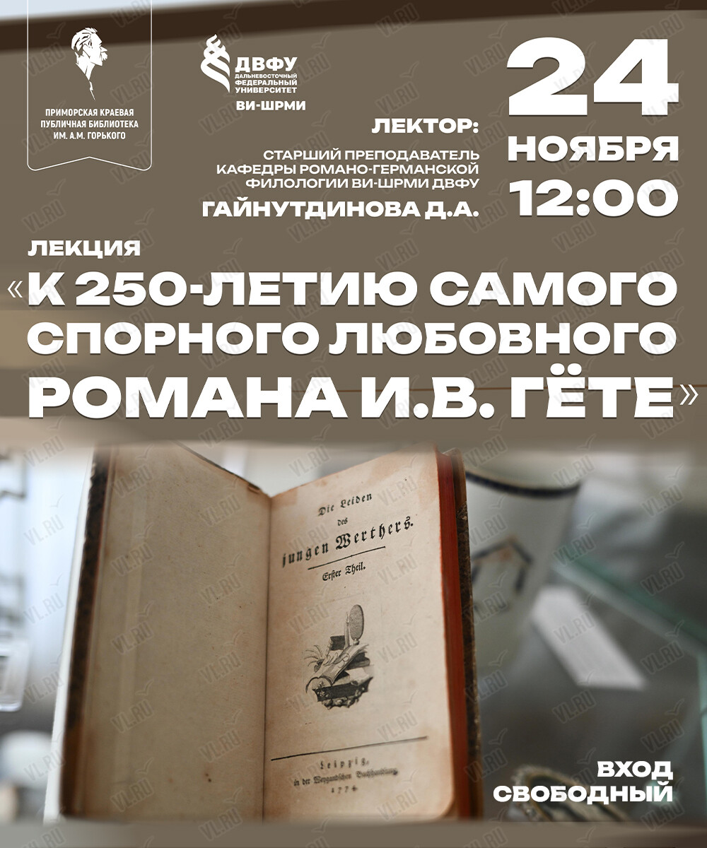24 ноября отдел иностранной литературы Приморской краевой библиотеки им. А.М. Горького приглашает на лекцию «К 250-летию самого спорного любовного романа И.В. Гёте».