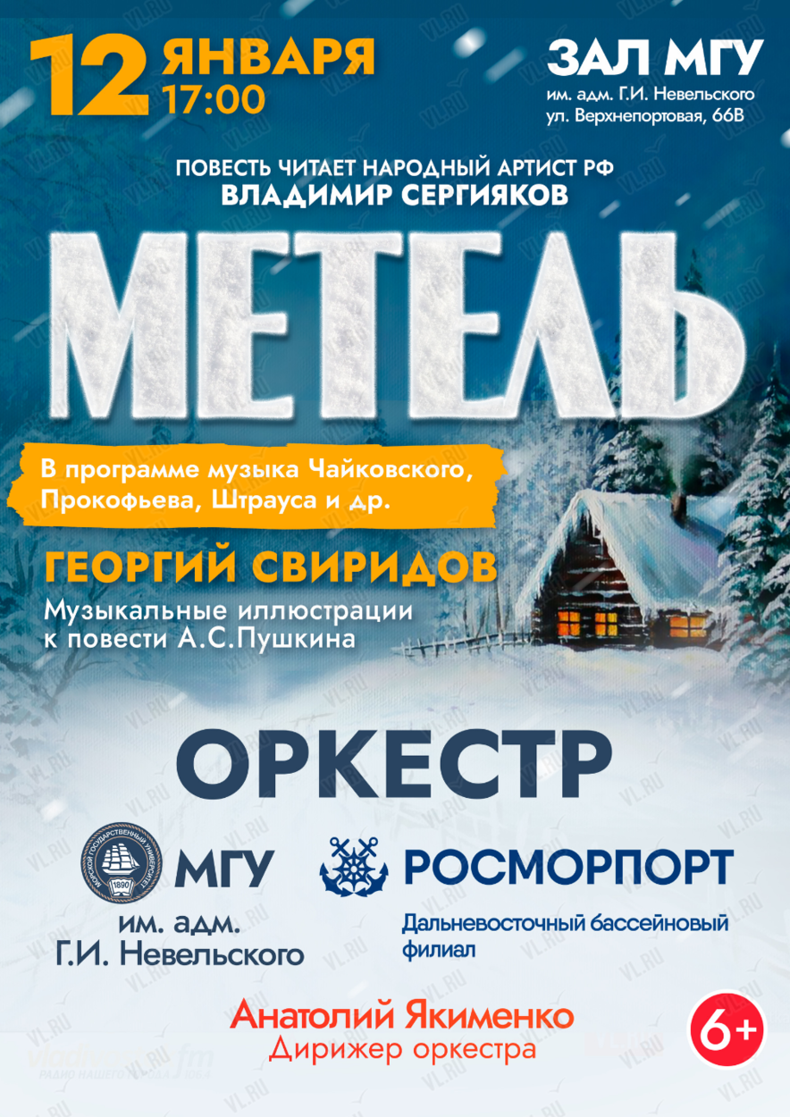 12 января 2025 года в 17:00 на сцене концертного зала МГУ им. адм. Г.И. Невельского состоится концерт эстрадного оркестра МГУ им. адм. Г.И. Невельского и Дальневосточного бассейнового филиала ФГУП «Росморпорт» (художественный руководитель и дирижер оркестра Анатолий Якименко).