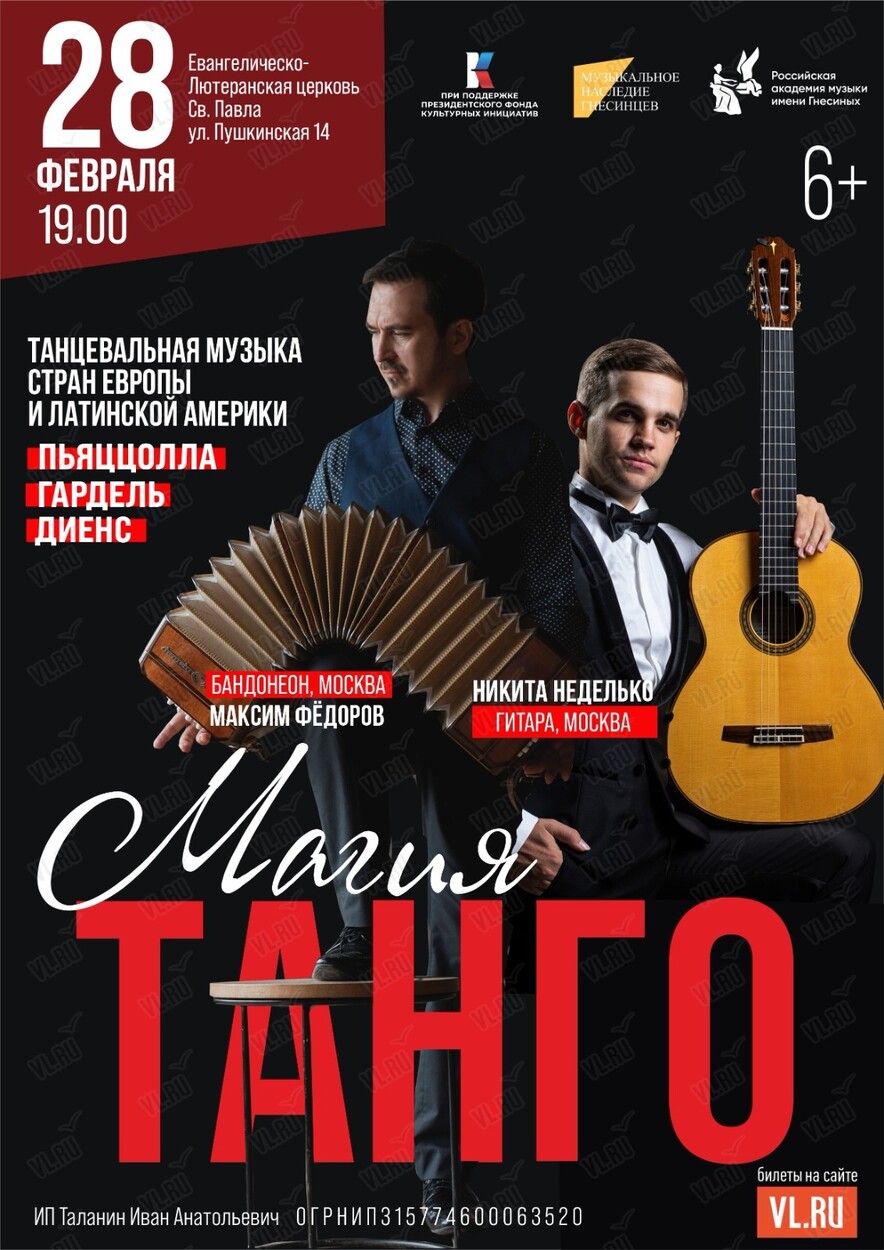 Исполнители: лауреат премии Министерства культуры РФ, лауреат Международных и Всероссийских конкурсов Максим Фёдоров (бандонеон), один из ярчайших представителей молодого поколения гитаристов России, лауреат всероссийских и международных конкурсов, лауреат премии Президента РФ Никита Неделько (гитара).