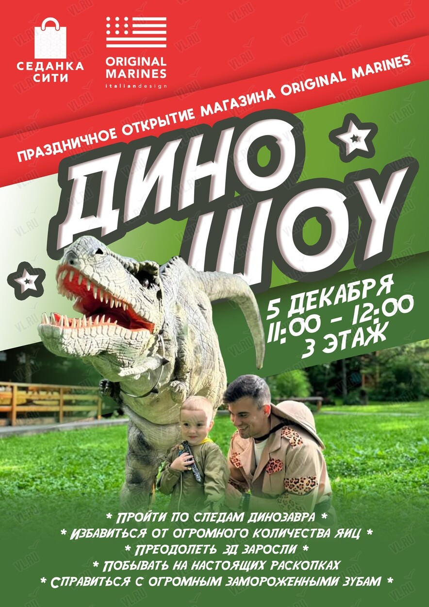 15 декабря на 3 этаже ТРК «Седанка Сити» пройдет Дино шоу (в рамках праздничного открытия магазина ORIGINAL MARINES).
