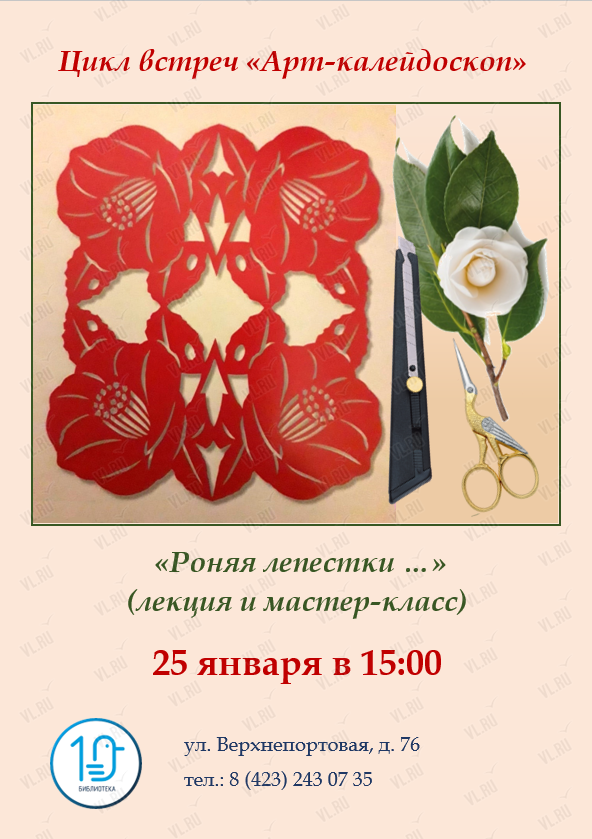 В заключении встречи состоится мастер-класс по созданию панно с цветами камелии в технике «киригами».