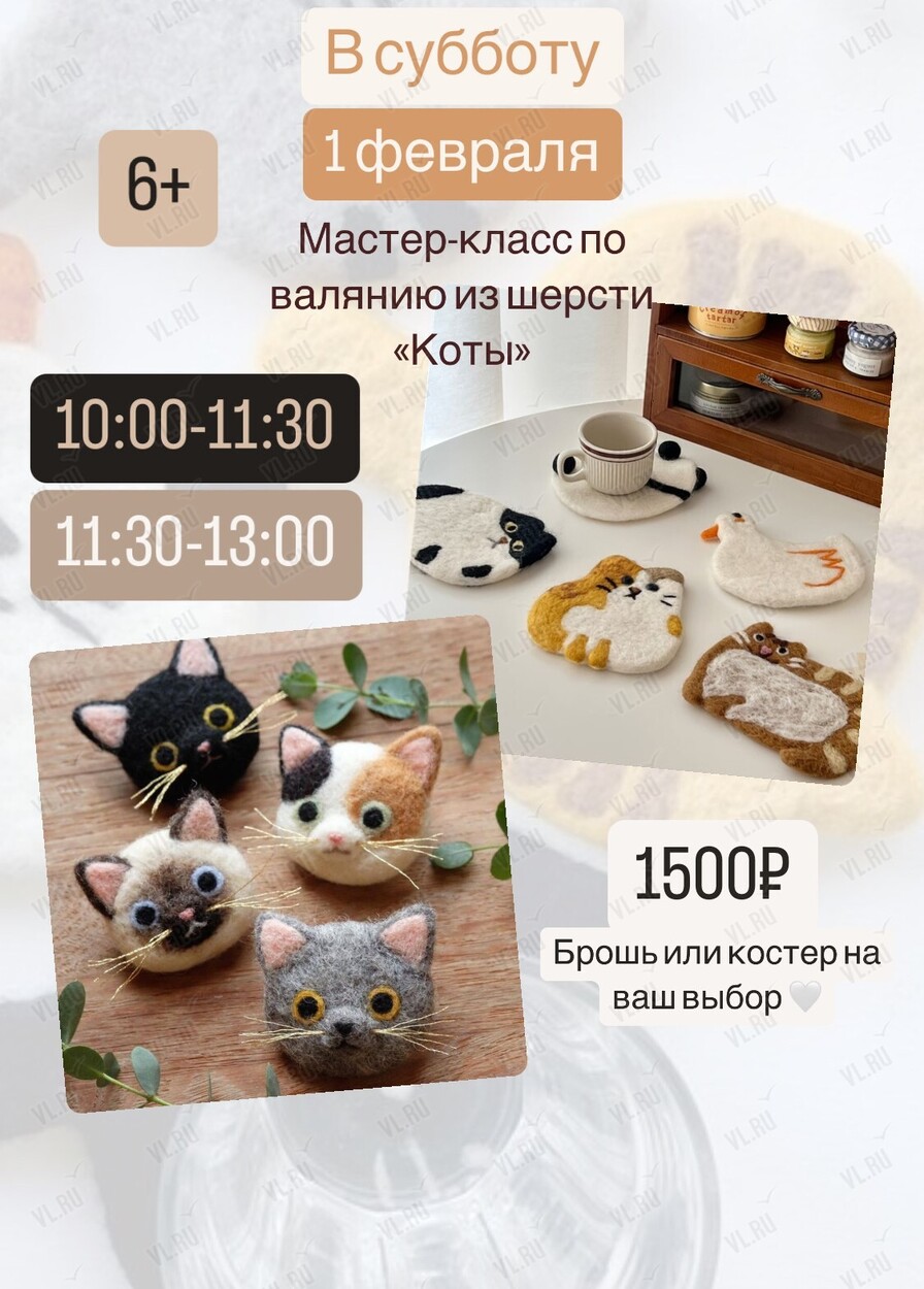 Под руководством преподавателя у вас будет возможность освоить технику сухого валяния и создать красивую подставку под стакан в виде забавного кота или брошь в виде кошачьей мордочки. Вдохновившись примерами и изучив основные приёмы, научитесь создавать изделия из шерсти и заберете домой после мастер-класса красивое изделие собственного авторства.