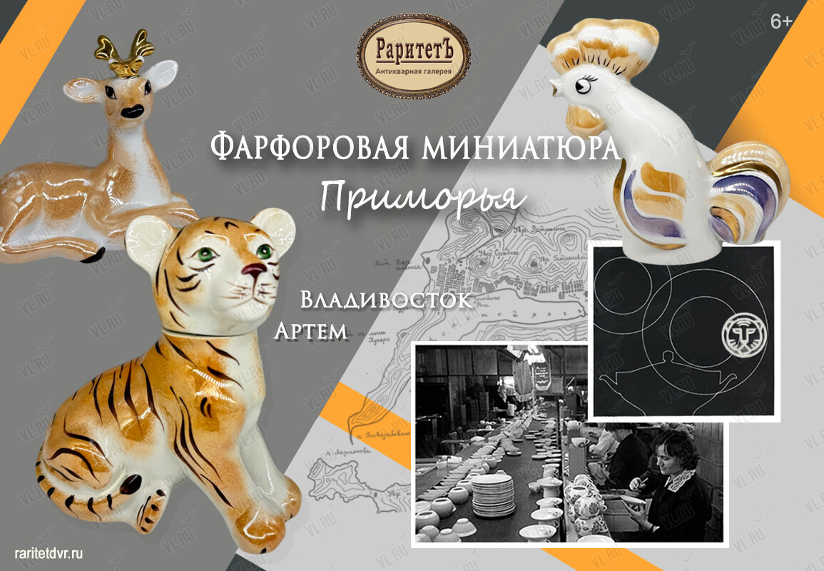 Хотя основная деятельность приморских мастеров фарфора была направлена на изготовление посуды - бытовой и лабораторной, Антикварная Галерея Раритет представляет другую ее сторону - скульптурную миниатюру. Хотя возникла она по экономическим причинам уже в поздние годы существования заводов, уровень мастерства скульпторов и художников позволил сувенирной продукции превратиться в полноценные коллекционные предметы. Статуэтки и миниатюрные панно воспроизводили изображения животных восточного гороскопа, таежных зверей и различных мифологических персонажей. «Почерки» предприятий оказались настолько индивидуальны, что позволяют не глядя на клейма почти всегда точно узнать изготовителя - Владивосток это или Артем.