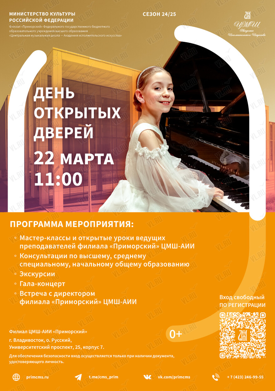 Министерство культуры Российской Федерации Филиал «Приморский» Федерального государственного бюджетного образовательного учреждения высшего образования «Центральная музыкальная школа – Академия исполнительского искусства» приглашает на День открытых дверей!