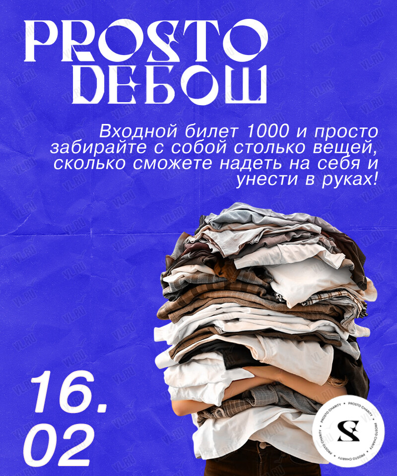 Вы платите 1000 руб. за вход с человека и 50 квадратных метров одежды в вашем распоряжении! Берете столько вещей сколько сможете надеть на себя и унести в руках! В акции участвует мужская, женская, детская одежда, обувь, аксессуары.