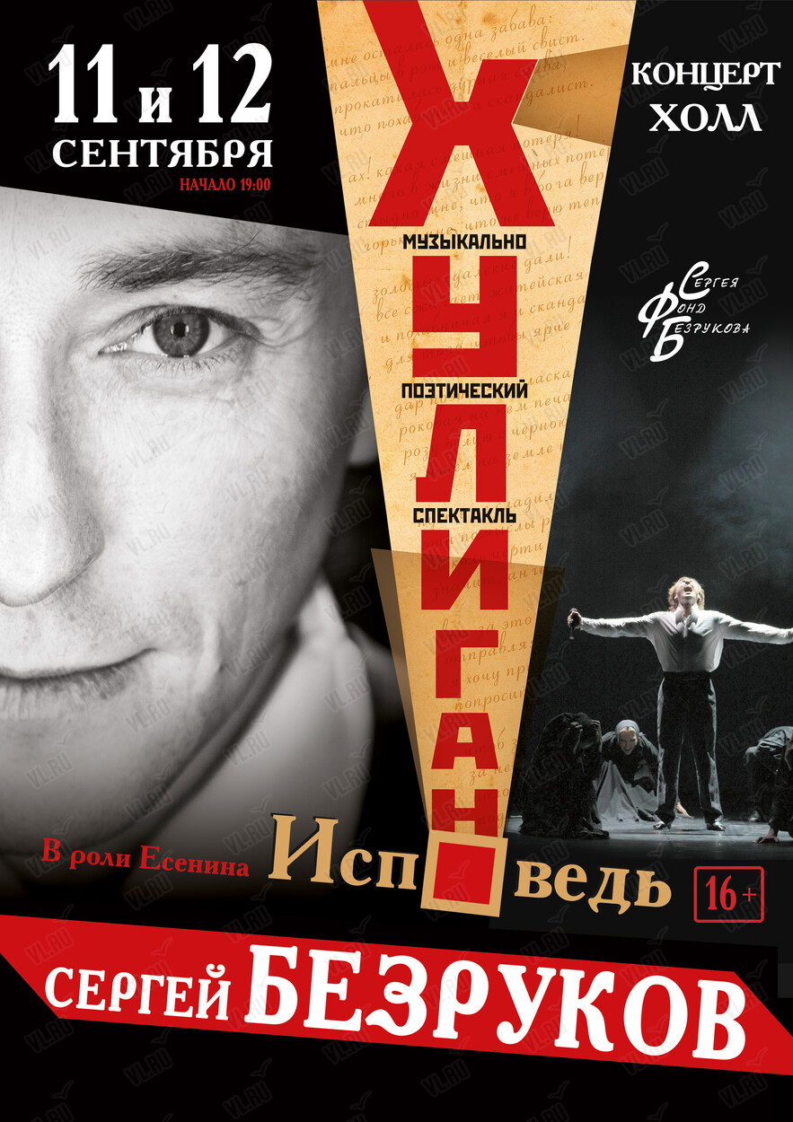 11 и 12 сентября на сцене «Концерт Холл» – музыкально-поэтический спектакль Сергей Безруков «Хулиган. Исповедь»!