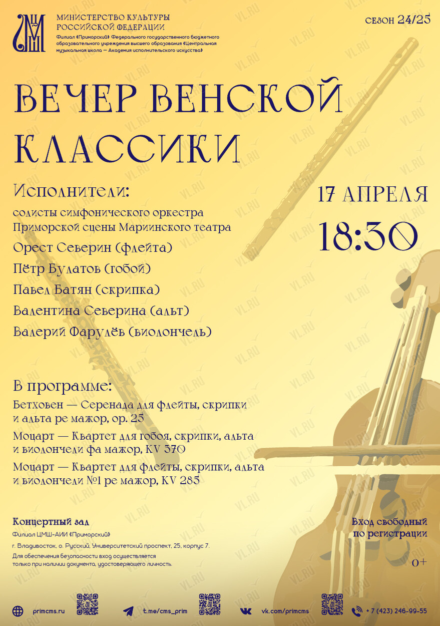 Министерство культуры Российской Федерации Филиал «Приморский» Федерального государственного бюджетного образовательного учреждения высшего образования «Центральная музыкальная школа – Академия исполнительского искусства» приглашает 17 апреля на концерт "Вечер венской классики".