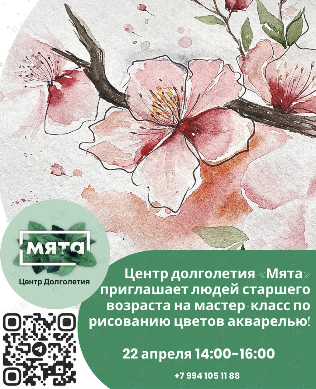 Центр долголетия «Мята» приглашает 22 апреля людей старшего возраста на увлекательный мастер-класс по рисованию цветов акварелью!