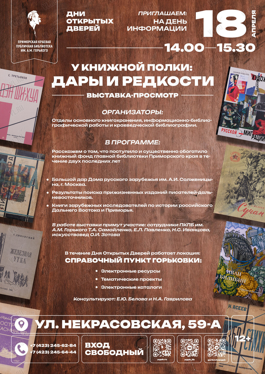Приморская краевая публичная библиотека им. А.М. Горького 18 апреля приглашает На День информации «У книжной полки : дары и редкости». Выставка-просмотр.