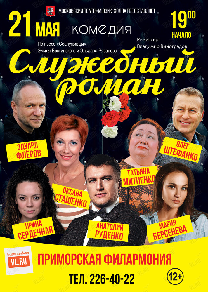 Московский театр «Мюзик-холл» продолжает гастрольный сезон премьерной комедией «Служебный роман» которая будет показана в г. Владивостоке 21 мая в Большом зале Приморской краевой филармонии.