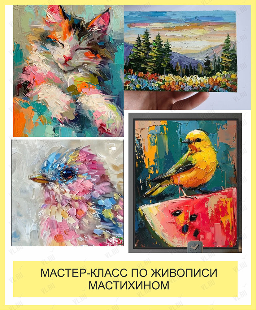 Мастихин - это современный инструмент для создания фактурной живописи. Под руководством опытного художника вы сможете создать полноценную работу. Работы будем создавать небольших размеров 18х24 см.