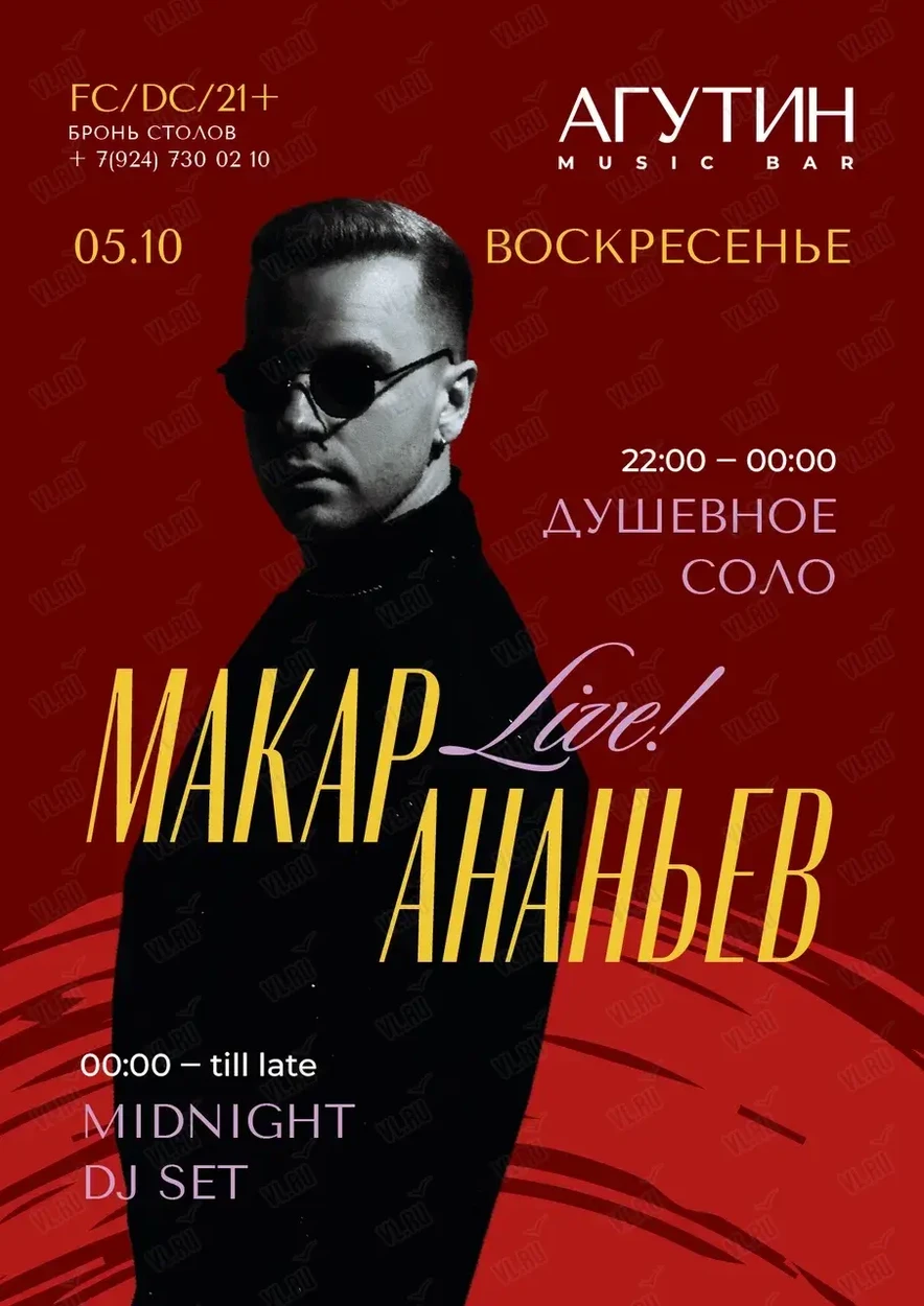 Душевное соло Макара Ананьева наполнит зал теплом и светлой лирикой. В репертуаре — авторские песни, а также любимые хиты Сплина, Би-2, Ed Sheeran и Sting и других.