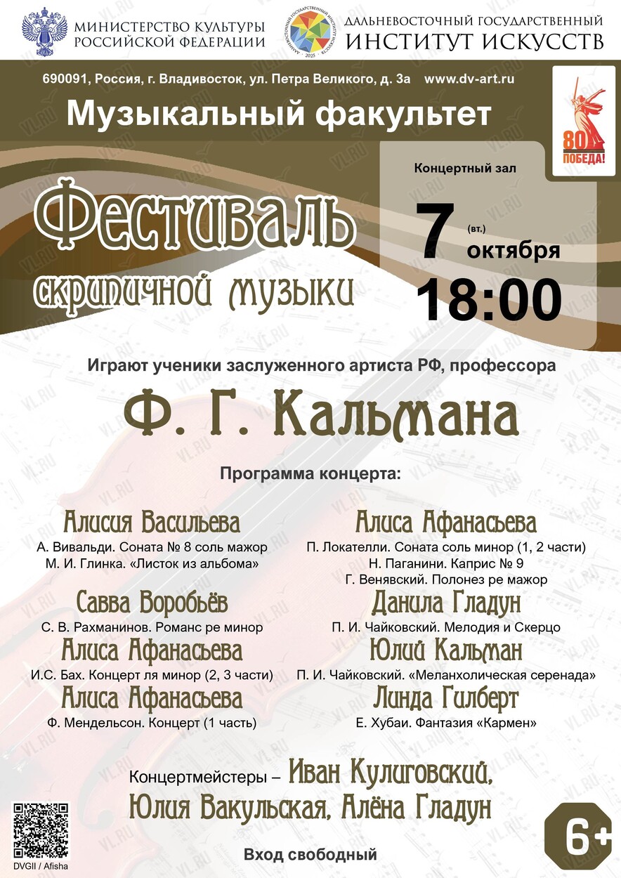 7 октября в концертном зале Дальневосточного государственного института искусств – Фестиваль скрипичной музыки!