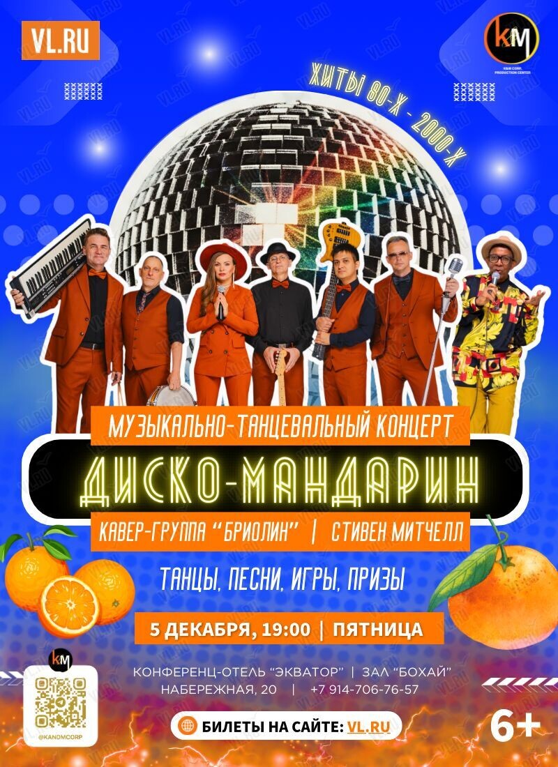 5 декабря в зале «Бохай» отеля «Экватор» пройдет кавер-вечеринка «Диско-мандарин»: хиты 80-2000-х от «Бриолин Ретро-Бэнд» и Стивена Митчелла!