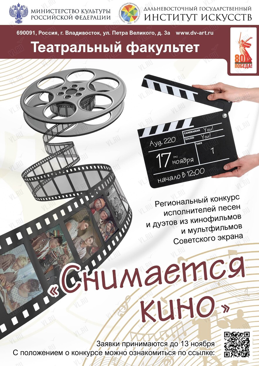 Дальневосточный государственный институт искусств приглашает принять участие в региональном конкурсе исполнителей песен и дуэтов из кинофильмов и мультфильмов Советского экрана «Снимается кино»!