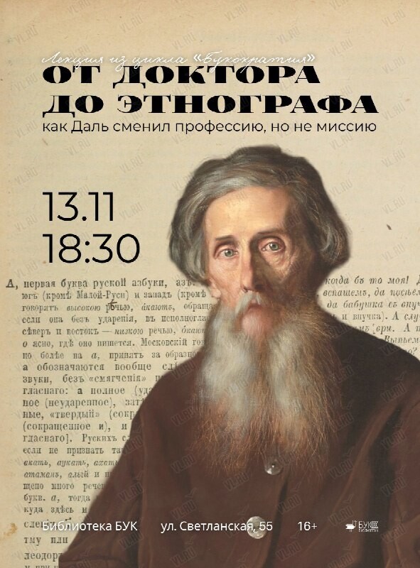 В преддверии дня рождения легендарного писателя в библиотеке БУК состоится традиционная встреча проекта «БУКоКратия», посвященная удивительной судьбе Владимира Даля. Лекция «От доктора до этнографа: как Даль сменил профессию, но не миссию» — 13 ноября в 18:30!