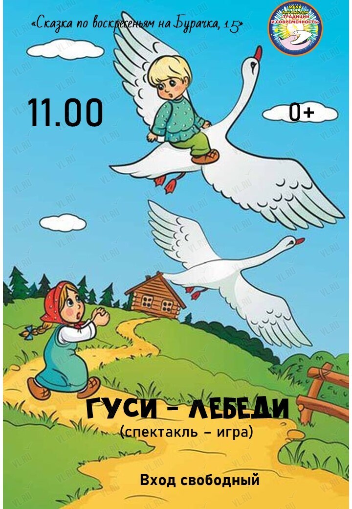 Театральный кружок Дома культуры «Традиции и современность» приглашает детей и взрослых 7 декабря в рамках творческого проекта для всей семьи «Сказка по воскресеньям на Бурачка, 15» принять участие в спектакле-игре «Гуси-лебеди».