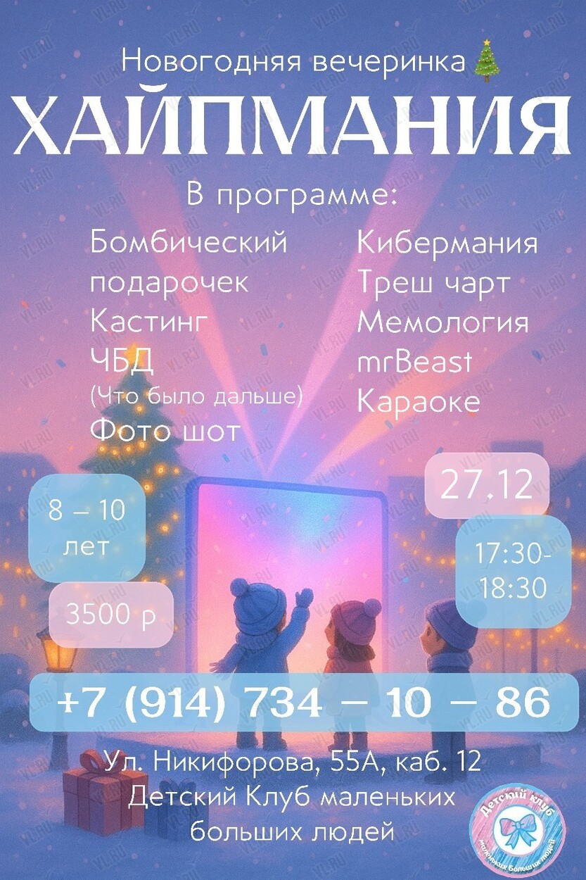 27 декабря в Клубе маленьких больших людей пройдет новогодняя вечеринка для детей «Хайпмания»!