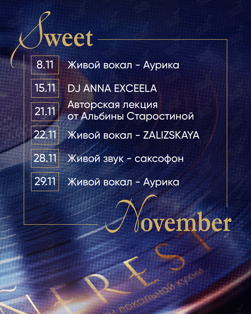 Ноябрь создан для теплых вечеров - когда музыка звучит мягче, напитки становятся горячее, а разговоры - искреннее. Каждую неделю будем встречаться за красивым звуком, живым голосом и атмосферой, в которой хочется задержаться.