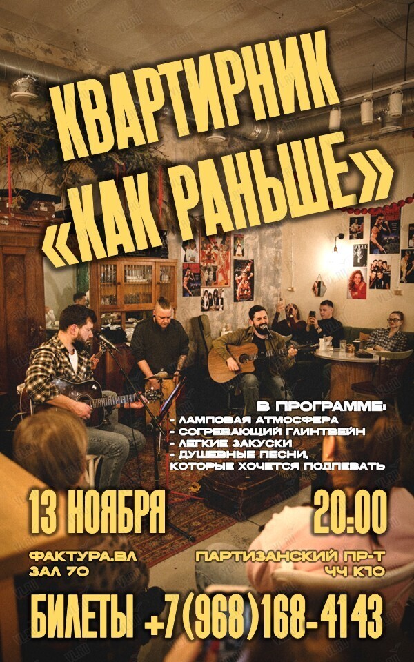 «Мы - группа Контрабанд.А из города Владивосток. Мы очень любим музыку, особенно ту, что вызывает чувство трепетной ностальгии. И мы хотим пригласить вас на музыкальный душевный квартирник, где мы все вместе с вами сможем вспомнить и спеть те самые песни».